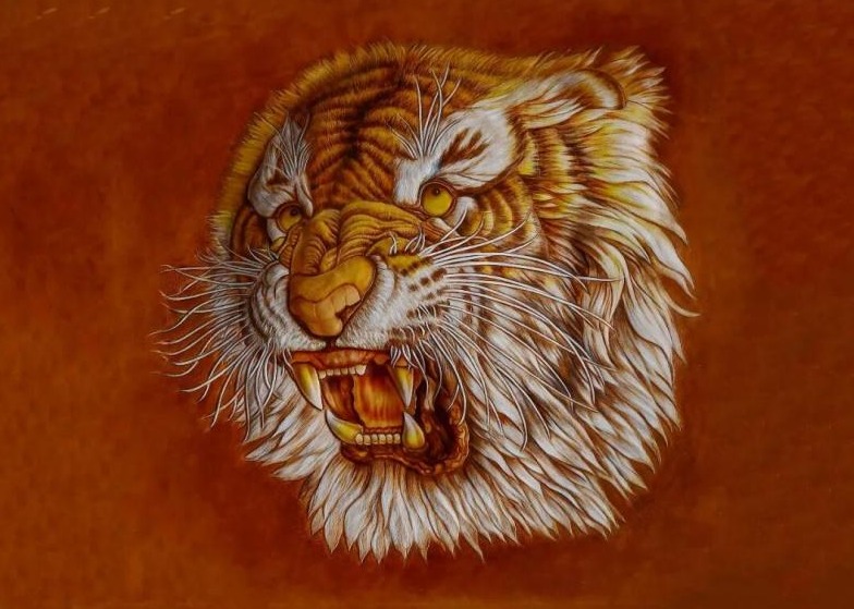 皮雕畫有著復(fù)雜的工藝流程,挑選牛皮后,創(chuàng)作過程融合繪畫、雕刻、敲打、染色、拋光、定型等工藝手法,大致算來,完成一件皮雕畫需十幾道工序。